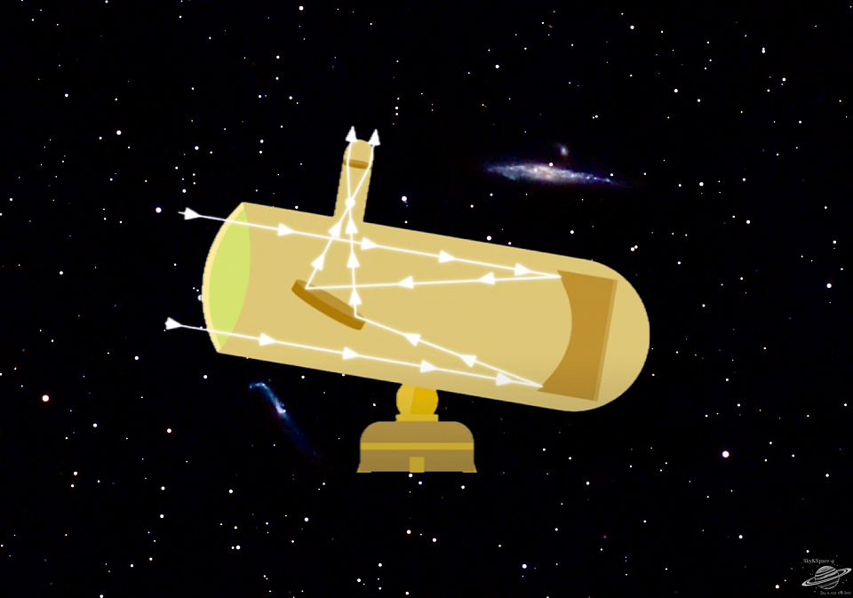 De spiegelkijker, dit is de telescoop die wij in de klas open hebben gemaakt zie plaatje hierboven ook wel reflector genoemd, werkt iets anders. Er zit geen lens in, maar een holle spiegel. Het licht valt op de spiegel, wordt teruggekaatst en valt op een klein vlak spiegeltje voor in de telescoop, om da in het oculair te komen zie plaatje hieronder
