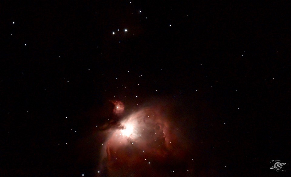 Afgelopen nacht net voor dat de bewolking toegenomen was nog even deze foto kunnen maken van De Orionnevel is een H-II-gebied in het sterrenbeeld Orion en wordt ook aangeduid met Messier 42 of NGC 1976. De Orionnevel is in donkere nachten redelijk goed met het blote oog te zien als een wazige vlek net onder de drie gordelsterren in het "zwaard van Orion