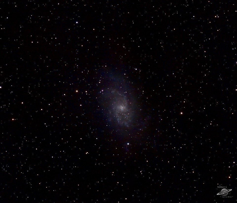 Ondanks het felle licht van de maan deze foto kunnen maken van Het Triangulum-sterrenstelsel (Messier 33) is een spiraalvormig sterrenstelsel op ongeveer 3 miljoen lichtjaar afstand in het sterrenbeeld Driehoek. Als derde grootste lid van de Lokale Groep (na Andromeda en de Melkweg) bevat het zo'n 40 miljard sterren. Het stelsel is bekend om zijn actieve stervorming en gebrek aan een centrale kern